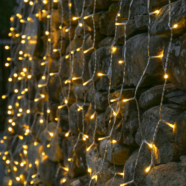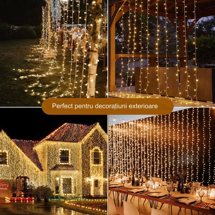 Designul tip „perdea ploaie” oferă un efect spectaculos de lumini care cad delicat, amintind de picături de gheață strălucitoare. Cu 600 de LED-uri distribuite uniform pe o lungime de 5 metri și o înălțime de 2 metri, această instalație acoperă o suprafață generoasă, ideală pentru decorarea ferestrelor, balconului, pereților, gardurilor sau acoperișurilor.