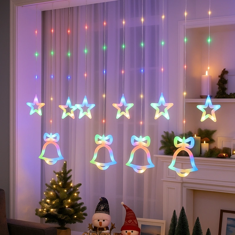 Instalație Luminoasă Crăciun cu 12 Fire, Lumina Multicolor, Clopotei si Stele LED, Decor Interior pentru Fereastră sau Brad