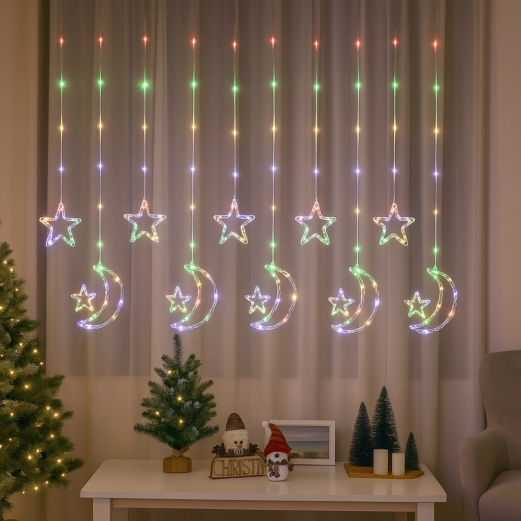 Instalație Luminoasă de Crăciun Multicoloră cu 12 Fire – Lună și Stele LED, Decor Interior pentru Fereastră sau Brad