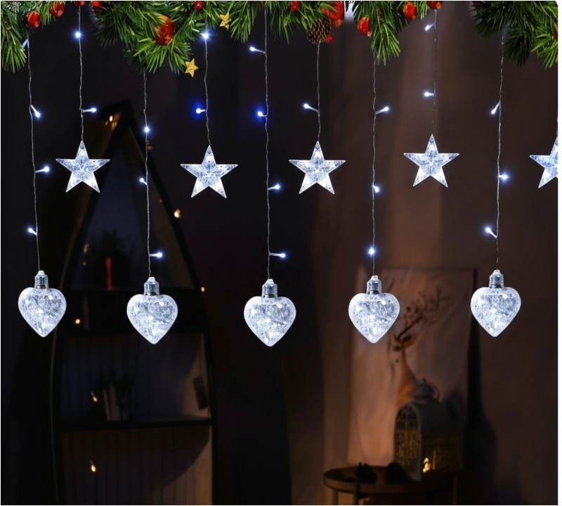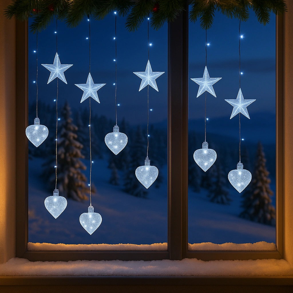 Învăluie-ți casa în farmecul iernii cu această instalație LED cu stele și inimi – lumină alb rece, simbolul perfect al eleganței, bucuriei și purității sărbătorilor!