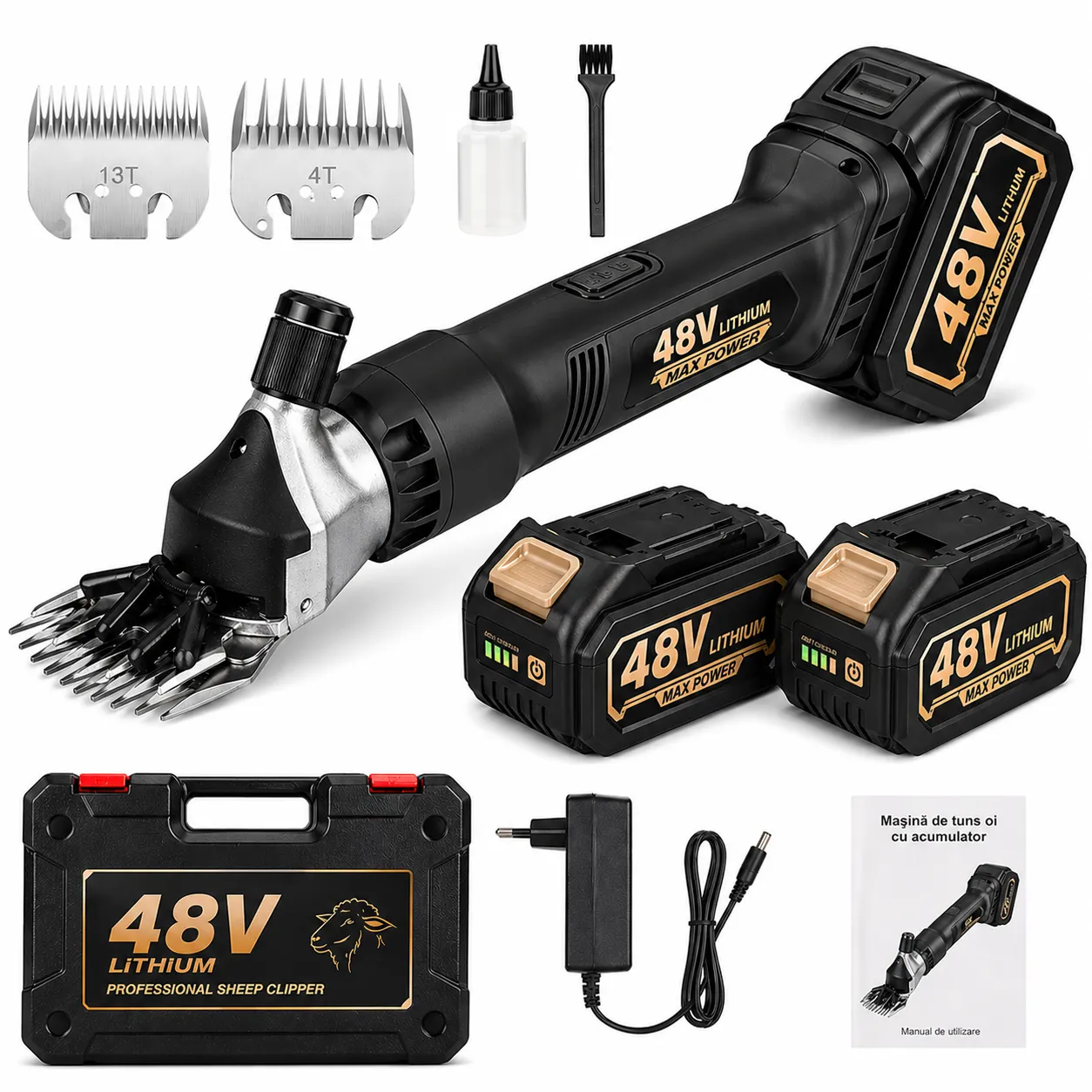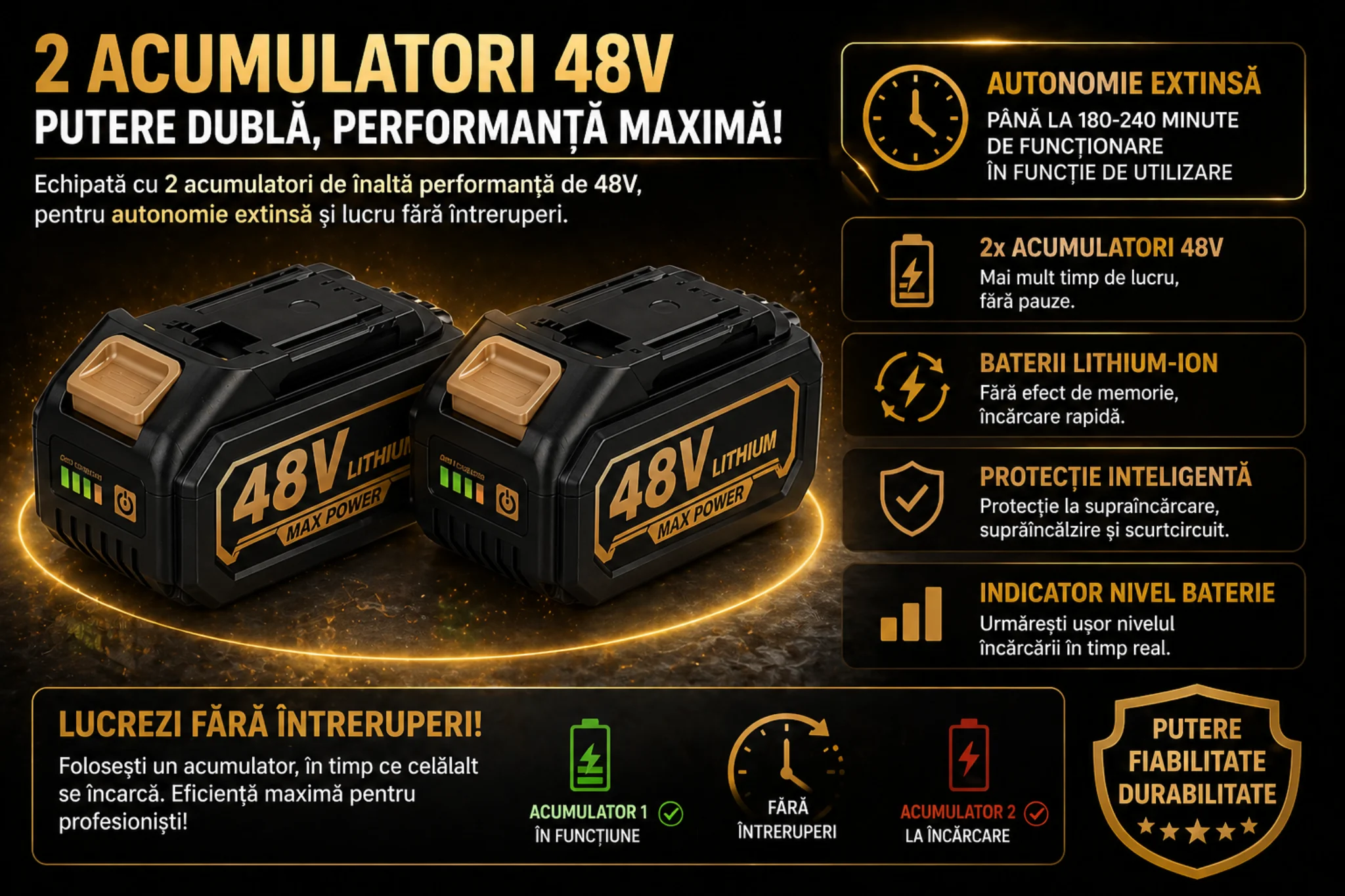 Dispozitivul vine cu doi acumulatori de 48V, oferind autonomie extinsă și libertate totală de mișcare, fără a depinde de o sursă de alimentare fixă. Astfel, poți lucra fără întreruperi, alternând acumulatorii pentru o utilizare continuă, ideală pentru ferme sau gospodării cu mai multe animale.