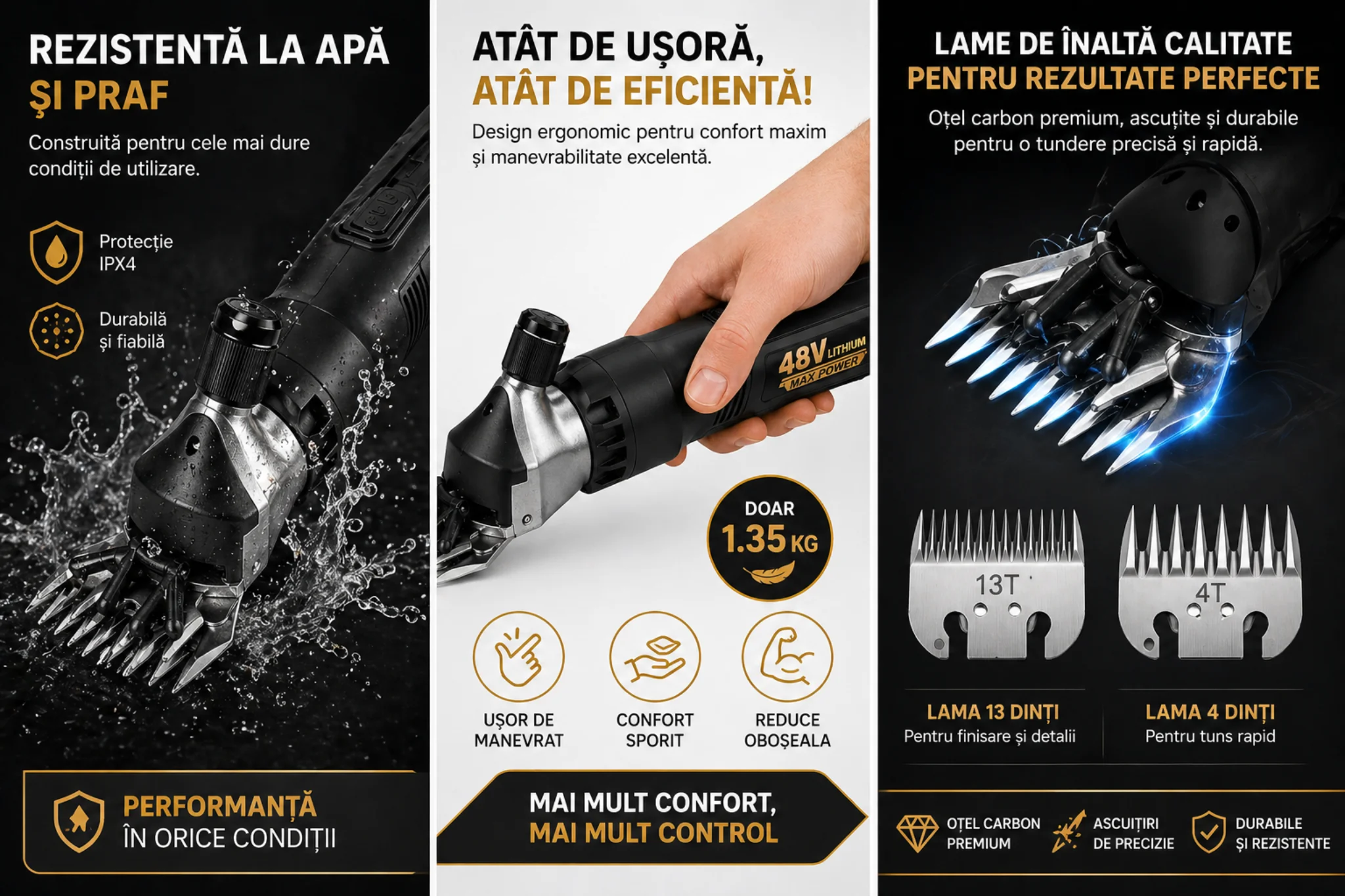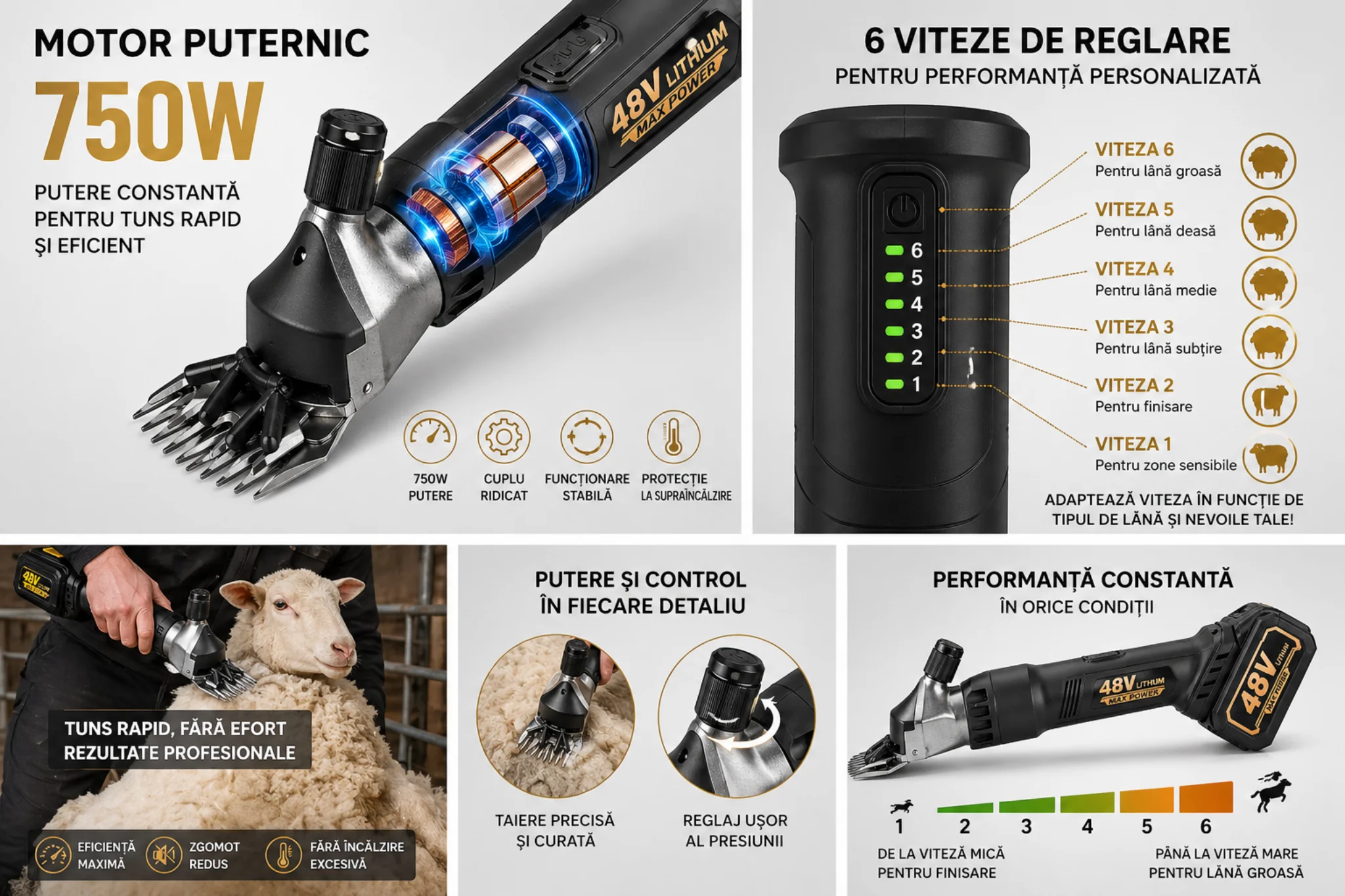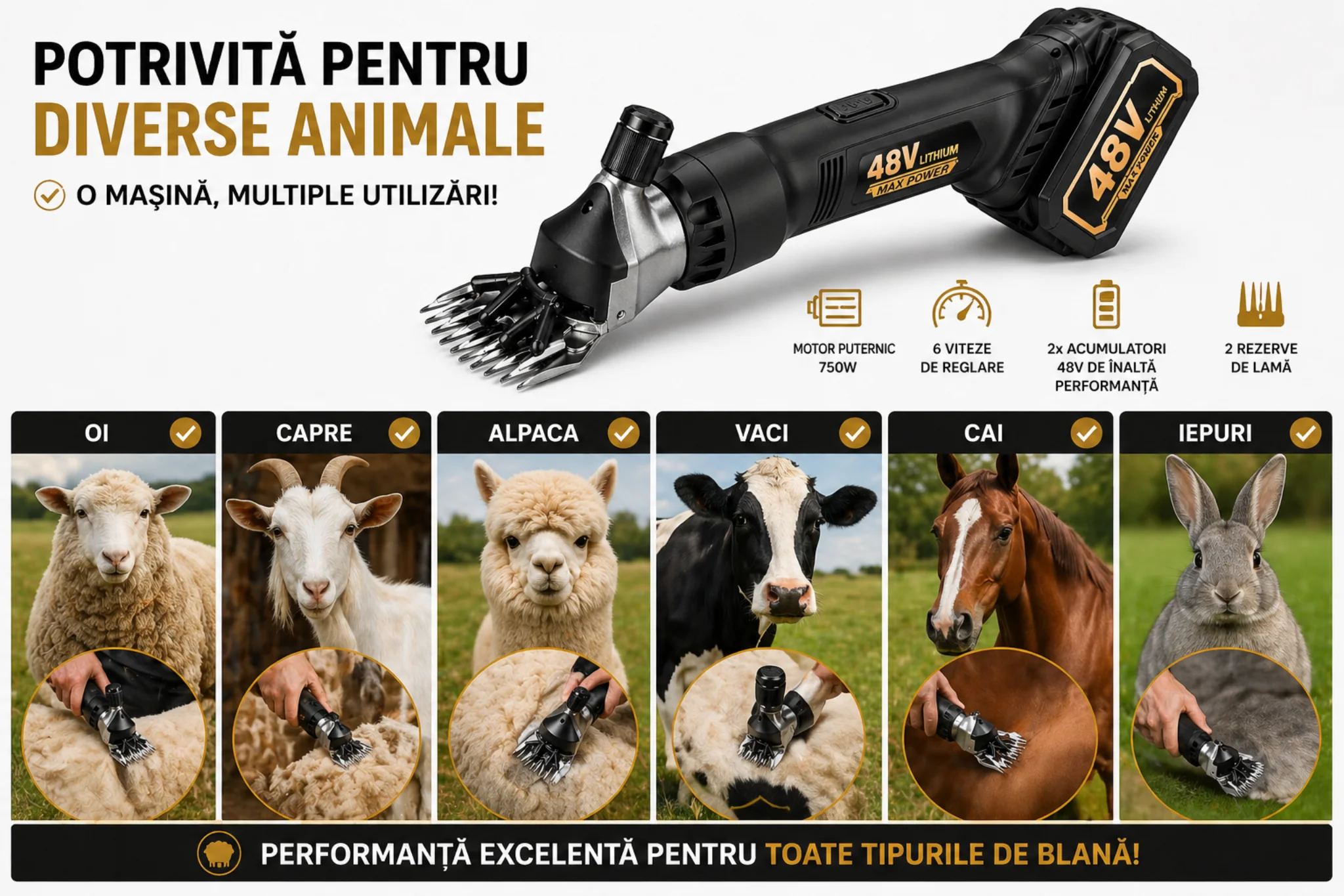 Cele 6 trepte de viteză permit ajustarea puterii în funcție de tipul de blană și sensibilitatea animalului, fiind potrivită pentru oi, capre, alpaca, câini de talie mare și alte animale cu blană groasă. Designul ergonomic reduce oboseala mâinii, iar nivelul de zgomot este optimizat pentru a nu speria animalele în timpul utilizării.