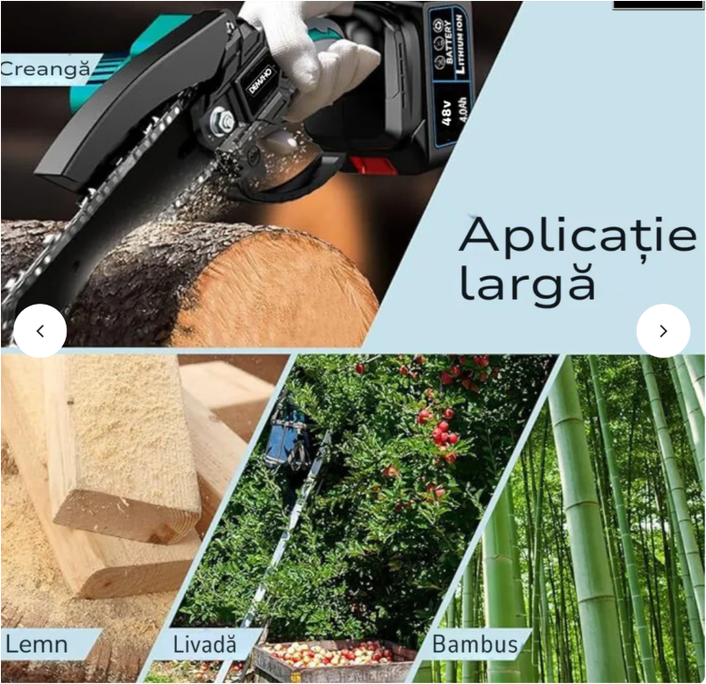 Mobilitatea oferită de acumulatorul de 48V face din acest mini fierăstrău cu lanț o unealtă indispensabilă în orice gospodărie modernă.