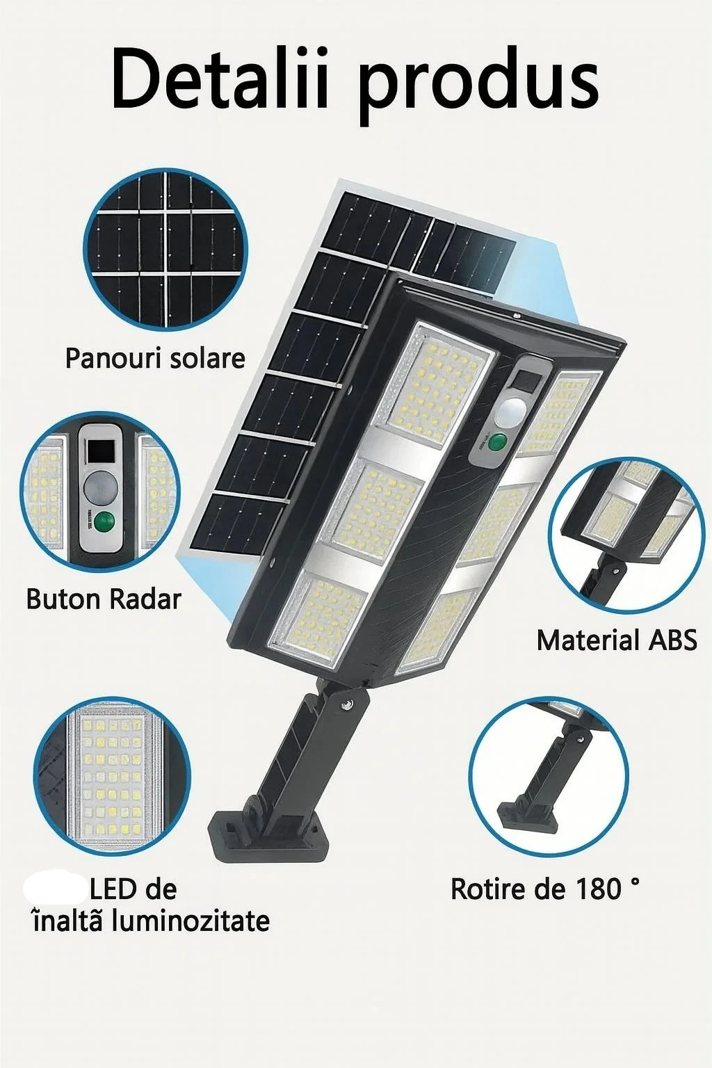 Transformă-ți curtea, grădina sau parcarea într-un spațiu sigur și luminos cu lampa solară LED de 200W, care funcționează complet fără cabluri și fără facturi la energie. Ideală pentru spații rezidențiale sau comerciale, această lampă combină tehnologia modernă cu autonomia completă și rezistența în orice condiții.