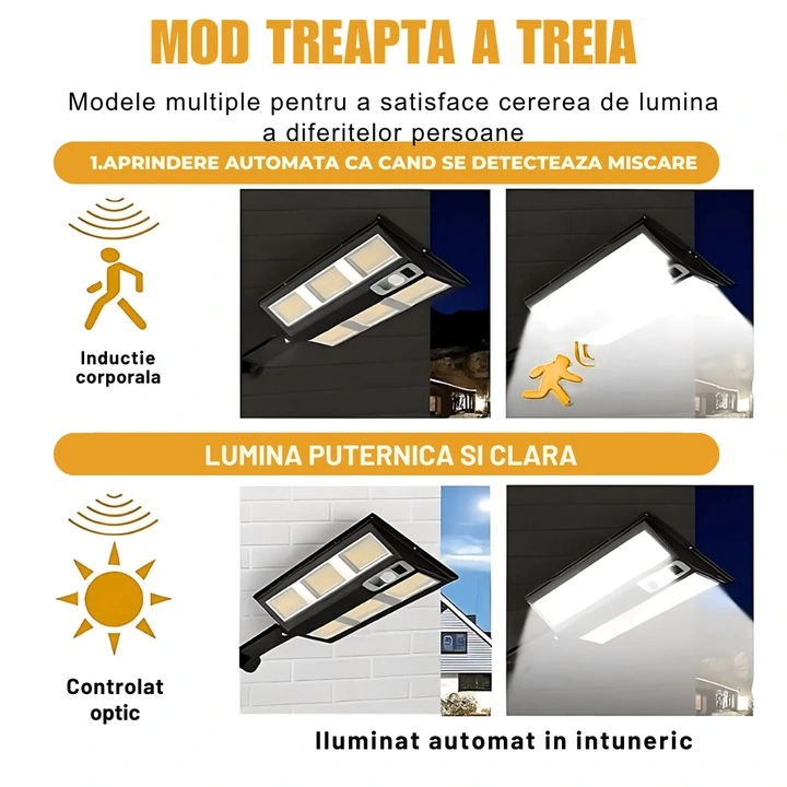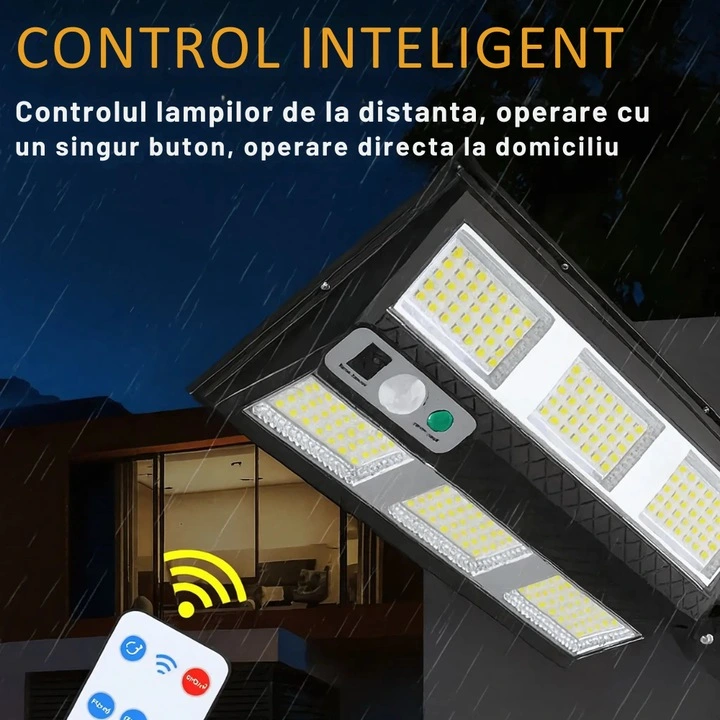 Senzorul de mișcare integrat activează automat lumina atunci când detectează prezența, sporind securitatea și reducând consumul de energie. În plus, telecomanda inclusă permite ajustarea modului de iluminare, intensității și duratei de funcționare, astfel încât să ai control complet asupra luminii.